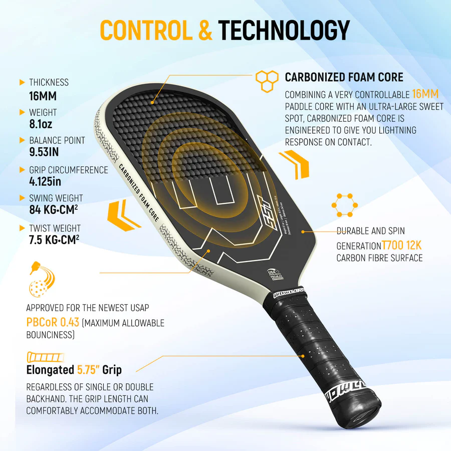 Our 16mm carbonized foam core combines lightning response with superior control. Premium T700 12K carbon fiber generates exceptional spin, while the elongated 5.75" grip accommodates any backhand style. Fully approved for USAP PBCoR 0.43 standards.