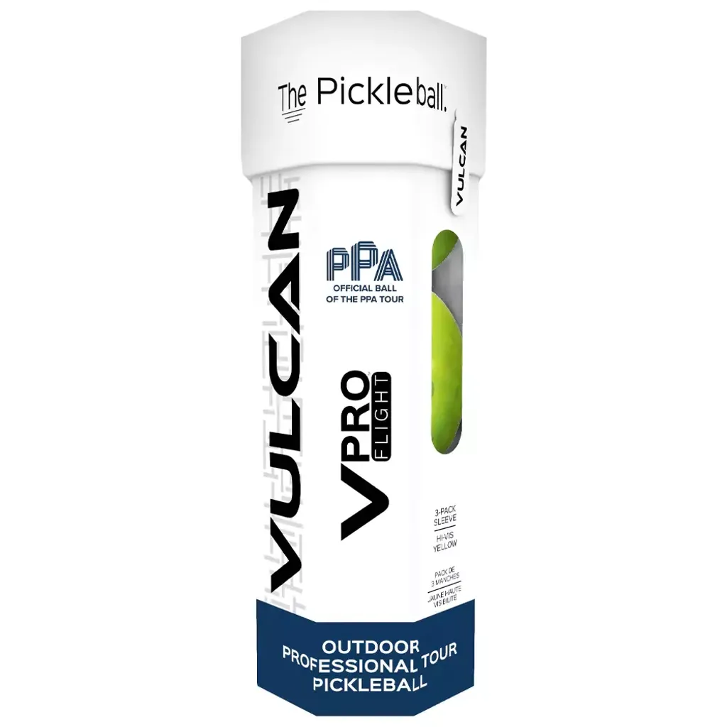 The Vulcan VPRO FLIGHT Outdoor Professional Tour Pickleball is now available in an exclusive 3-pack sleeve, featuring PPA "Official Ball" branding. This sustainable packaging also serves as a handy ball storage container.